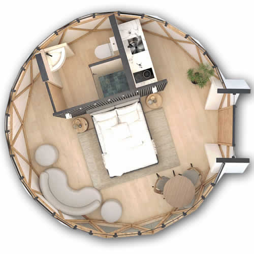El Domo Confort Plus ofrece una distribución pensada para alojamientos que requieren mayor autonomía: incluye una habitación privada, baño completo y cocina integrada, lo que lo convierte en una opción ideal para estancias prolongadas o uso como cabaña autosuficiente. A diferencia del modelo Suite, este formato está orientado a brindar al huésped una experiencia más independiente, con todas las comodidades necesarias para alojarse, cocinar y disfrutar del espacio sin depender de servicios externos.